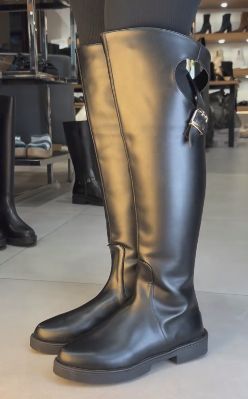 Black cross-strap leather high boots