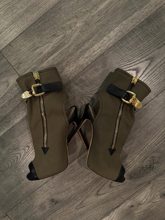 Army green and gold zipper hollow ankle boots